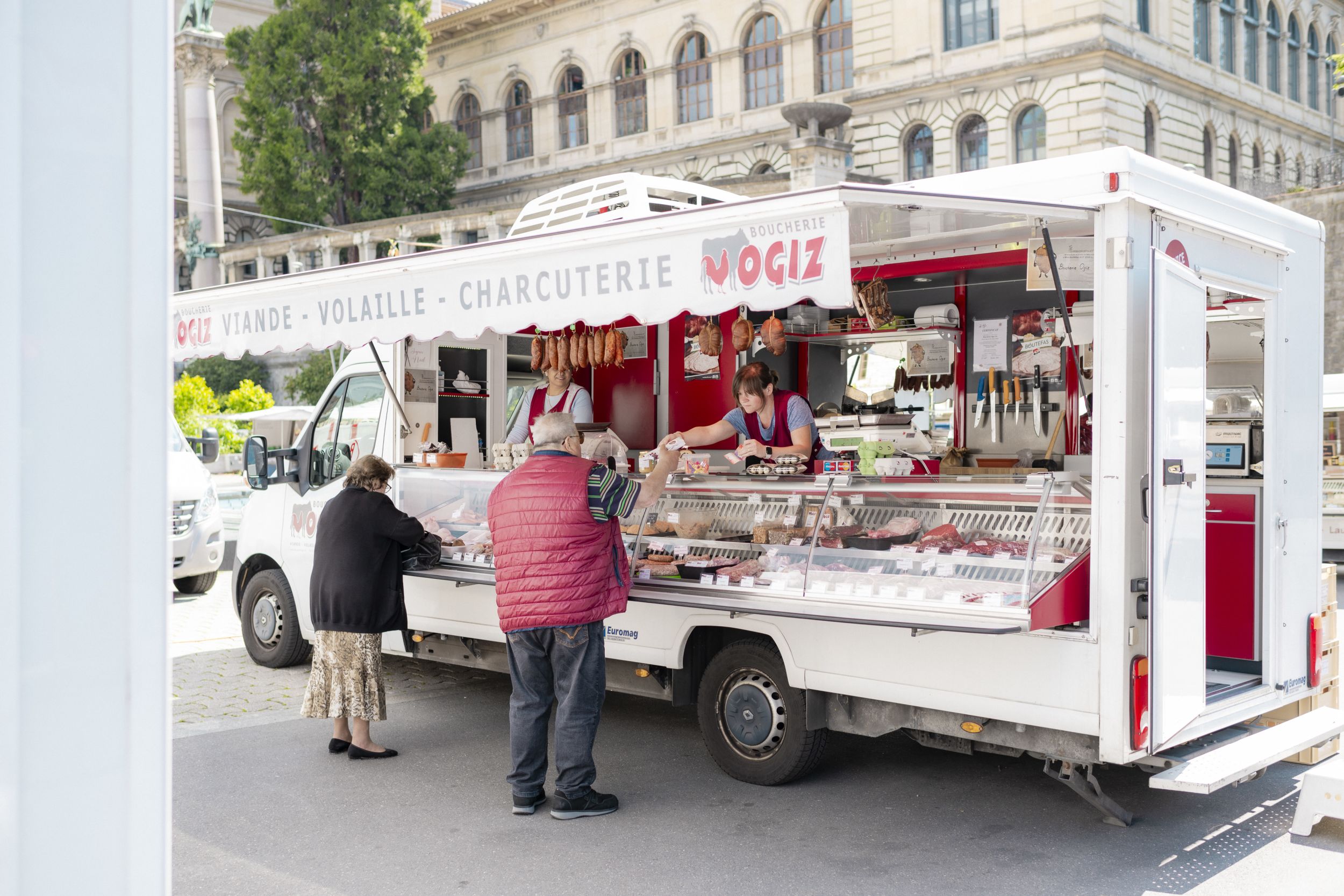 Diese Familienmetzgerei bietet seit drei Generationen Waadtländer Spezialitäten wie die Wurst Boutefas an. Der Fleischstand wartet mit einem reichen Angebot an Würsten, gebratenem Poulet und salzigem Gebäck auf.