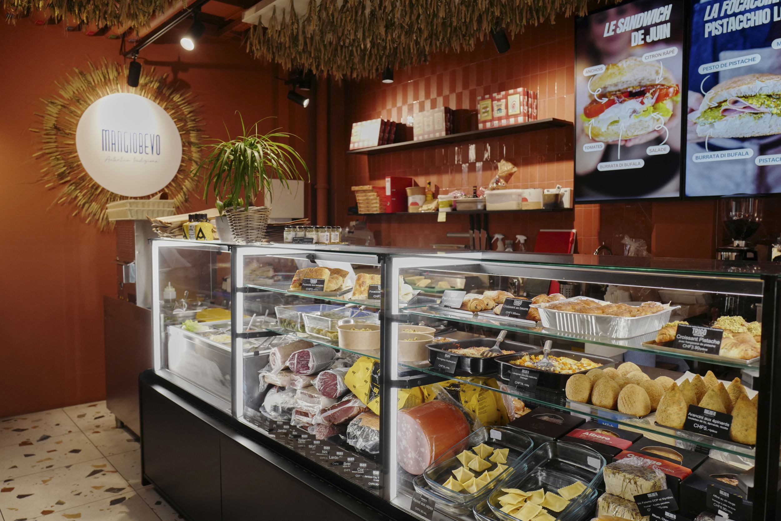 Neben seinen berühmten, im Handumdrehen zubereiteten Paninis, seinen Ostertauben und Panettoni bietet das Mangiobevo ausserdem Apéro-Boxen, Wurstwaren, Käse, hausgemachte Tiefkühlpizzen, Weine und Spirituosen sowie zahlreiche weitere Delikatessen an.