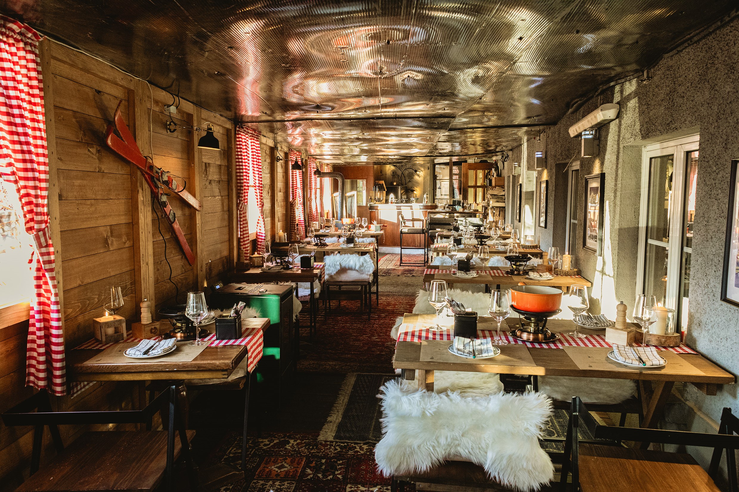 Achtung! Supergemütliche Einrichtung voraus. Um es zu genießen, begeben Sie sich auf die Terrasse des Vieux-Lausanne, die für die Saison in ein echtes Chalet verwandelt wurde: mit einem Kamin und einer holzgetäfelten Innenausstattung wie in einem echten Alpenchalet, sogar mit den berühmten rot-weiß karierten Vorhängen. Der perfekte Ort, um ein Fondue halb und halb, ein saftiges Raclette oder einen legendären Vacherin Mont D’Or-Käse zu genießen, der nach traditioneller Art zubereitet wird.