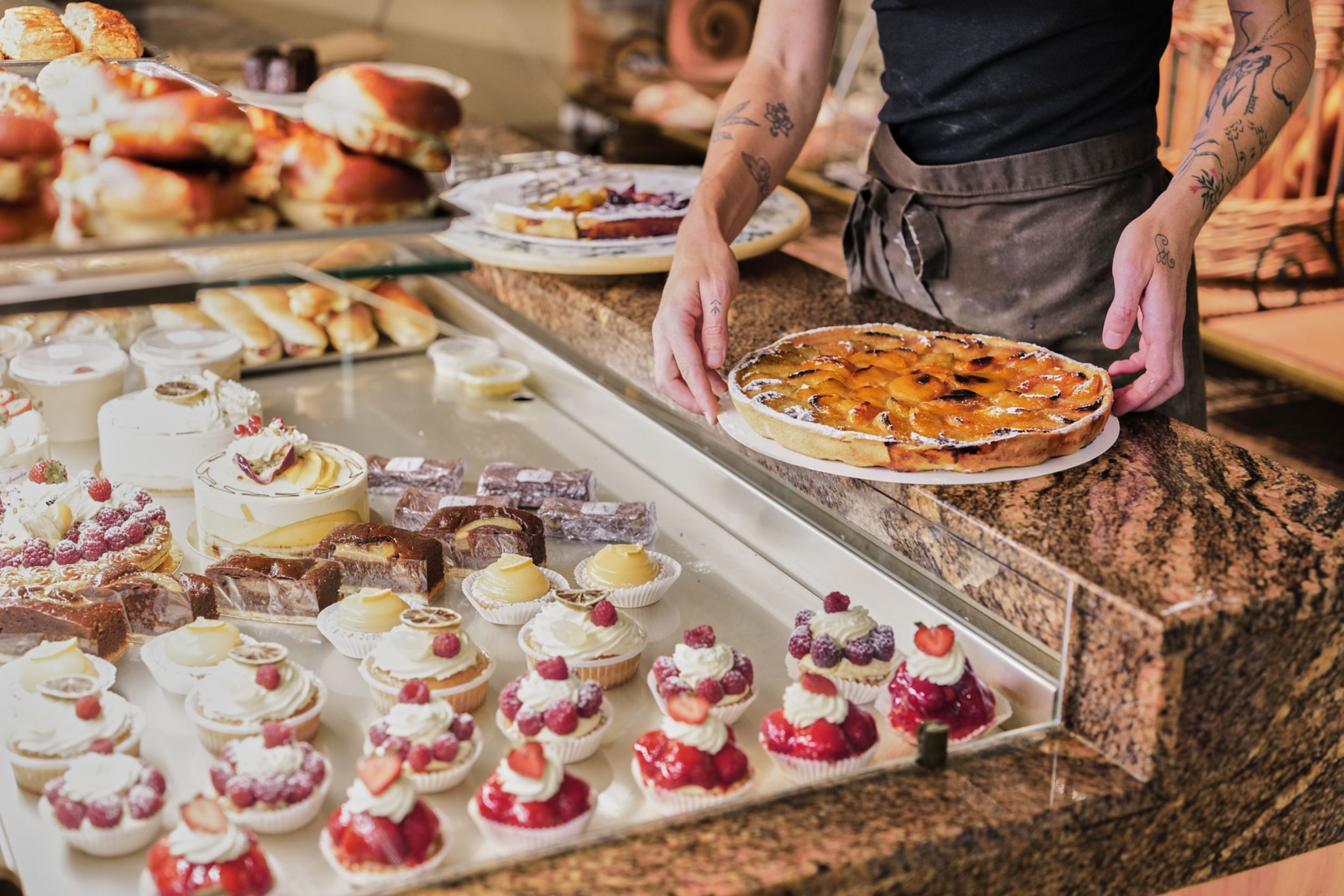 In the morning, L’Amandine bakery serves delicious pure butter pastries, sourdough breads and takeaway coffee. In the afternoon, fruit tarts and homemade ice creams take their place.