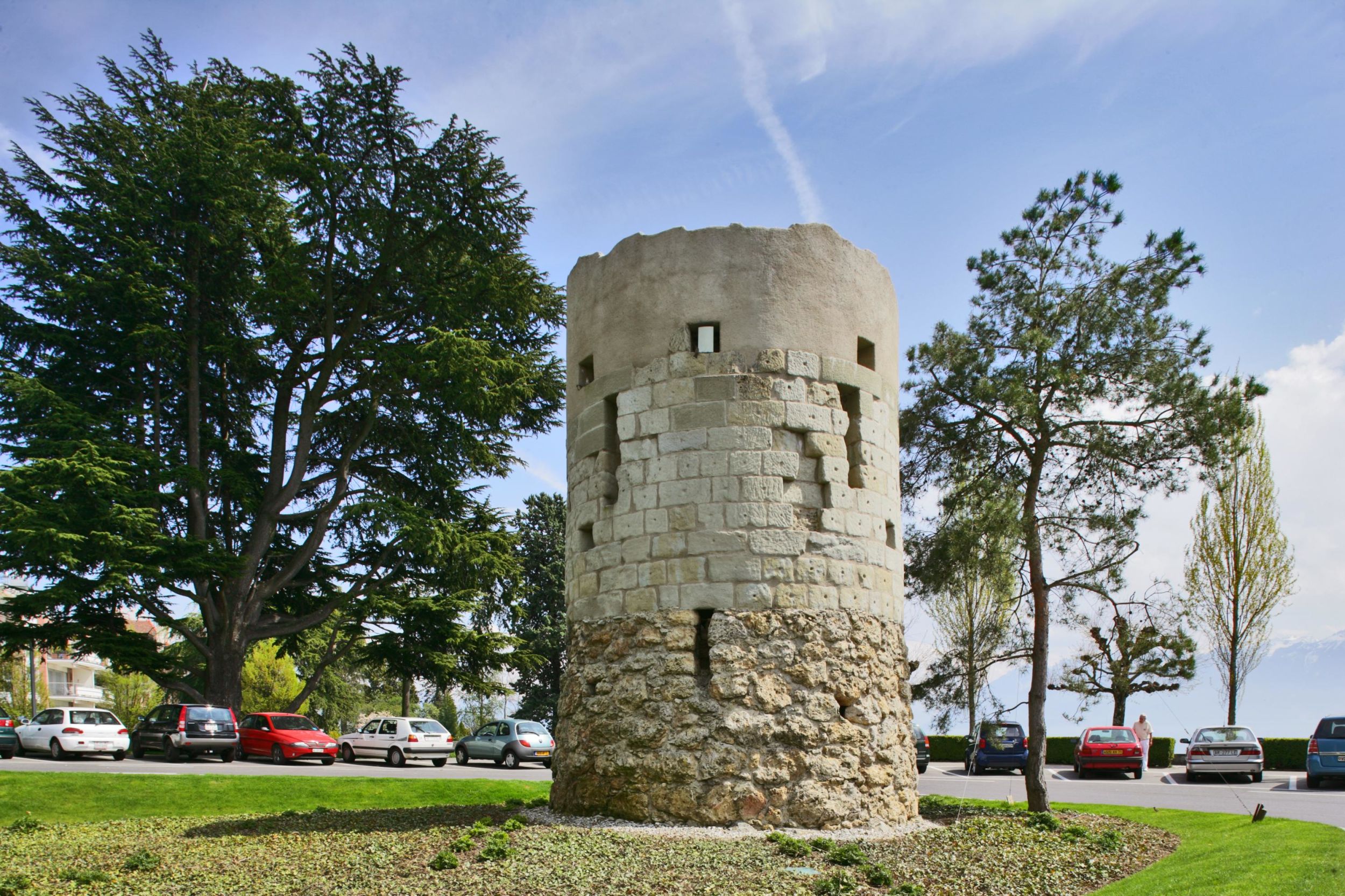 At the end of these promenades, one finds the Tour Haldimand. This structure, built in about 1825, was the result of a whimsical competition between three notables of the period, one of whom was William Haldimand, then owner of the Denantou estate. The goal of the competition was to build the most beautiful ruined medieval tower. This structure, which then stood almost in the water, won the first prize.